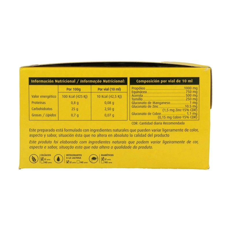 Propóleo 1000 mg, echinácea (Echinacea angustifolia) 750 mg, acerola (Crataegus azarolus) 500 mg, tomillo (Thymus vulgaris) 250 mg, manganeso gluconato 1 mg, zinc gluconato 10.5 mg (15% VRN), cobre gluconato 1.1 mg (15% VRN)