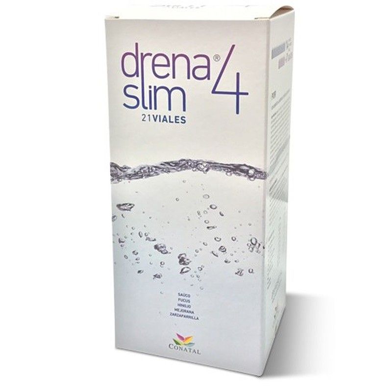 Drena Slim 4 viales Conatal es un complemento alimenticio a base de extractos de plantas que te ayudarán a drenar y depurar tu organismo eliminando toxinas y el exceso de líquidos. Su formula aporta: saúco, hinojo, fucus, zarzaparrilla, mejorana, romero y manzanilla. Combinación que estimula de forma suave y natural los órganos excretores (riñón e hígado) mejorando su funcionamiento para que el organismo pueda eliminar líquidos y toxinas acumuladas. Este tratamiento activa y mejora el funcionamiento de tu organismo en general influyendo en tu estado de salud general y potenciando el resultado de otros tratamientos y/o dietas.
