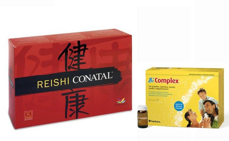 El Pack Hiper Defensas combina dos grandes productos naturales para subir las defensas bajas de un modo rápido. BiComplex 20 viales de Herbora es uno de los productos más contrastados y eficaces a la hora de acometer el aumento de las defensas de nuestro sistema inmunitario. Reishi 30 ampollas Conatal contiene esteroles y sustancias tipo cortisona con parecidos efectos (no tan pronunciados) pero sin las contraindicaciones de ésta pudiéndose emplear por tanto en casos de dermatitis, y afecciones de la piel, previniendo la predisposición a las alergias. Otro de sus componentes es la endorfina con lo que se puede decir que reduce el dolor crónico, como el de las dolencias articulares. Tiene también efecto adaptogénico (stress, ansiedad), hepatoprotector y depurativo sanguíneo, siendo de eficaz ayuda en los trastornos cardiovasculares siendo además hipotensor.
