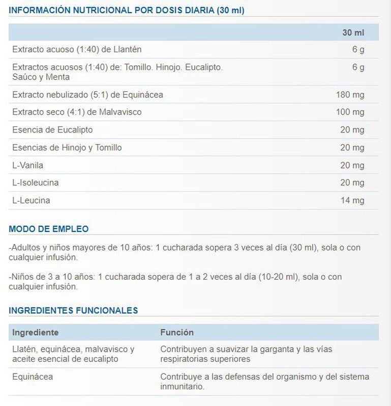 Ingredientes: Extracto acuoso (1:40) de plantas: llantén, tomillo, hinojo, eucalipto, saúco y menta; miel de eucalipto, azúcar, concentrado de uva blanca, concentrado de manzana, extracto de malta de cebada, extracto (5:1) de equinácea, extracto de regaliz, extracto (4:1) de malvavisco, ácido cítrico, conservador: sorbato potásico, aminoácidos: L-Valina, L-Isoleucina y L-Leucina, y esencias de: eucalipto, hinojo y tomillo.